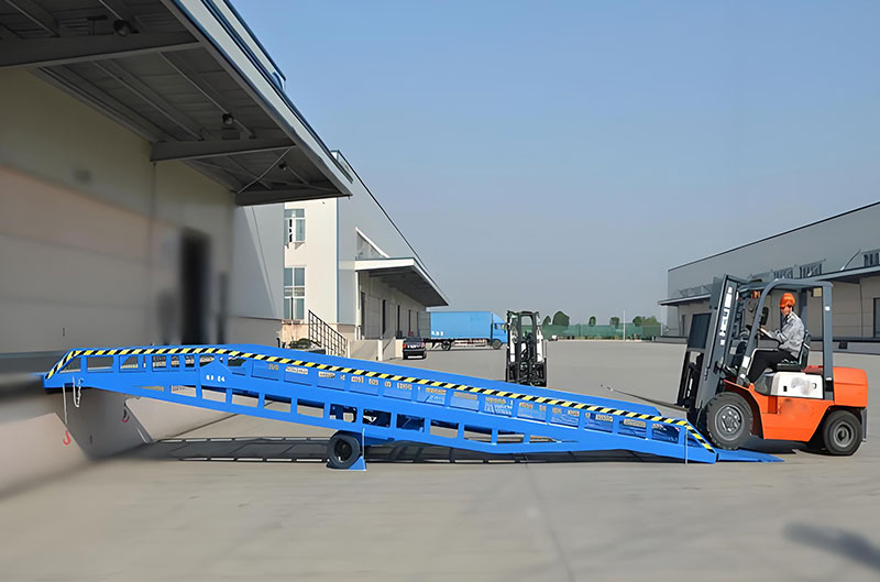 集裝箱登車橋是與叉車配合使用的貨物裝卸專用輔助設備。有了它,叉車能直接從地面駛入汽車車廂內部進行批量裝卸作業。移動登車橋采用人工液壓動力,不需接 動力電源,只需單人操作,即可實現貨物的安全快速裝卸。它可使企業減少大量勞動力,成倍提高裝卸作業效率,加快貨物流通速度,獲取更大經濟效益。